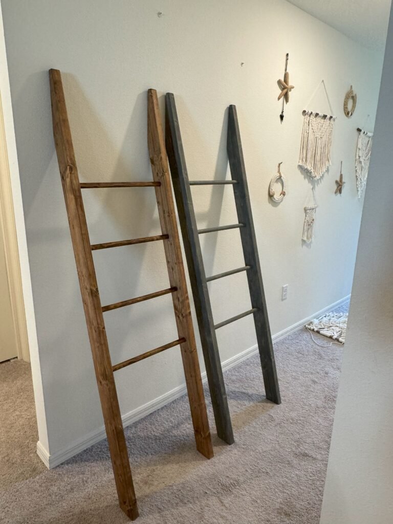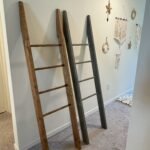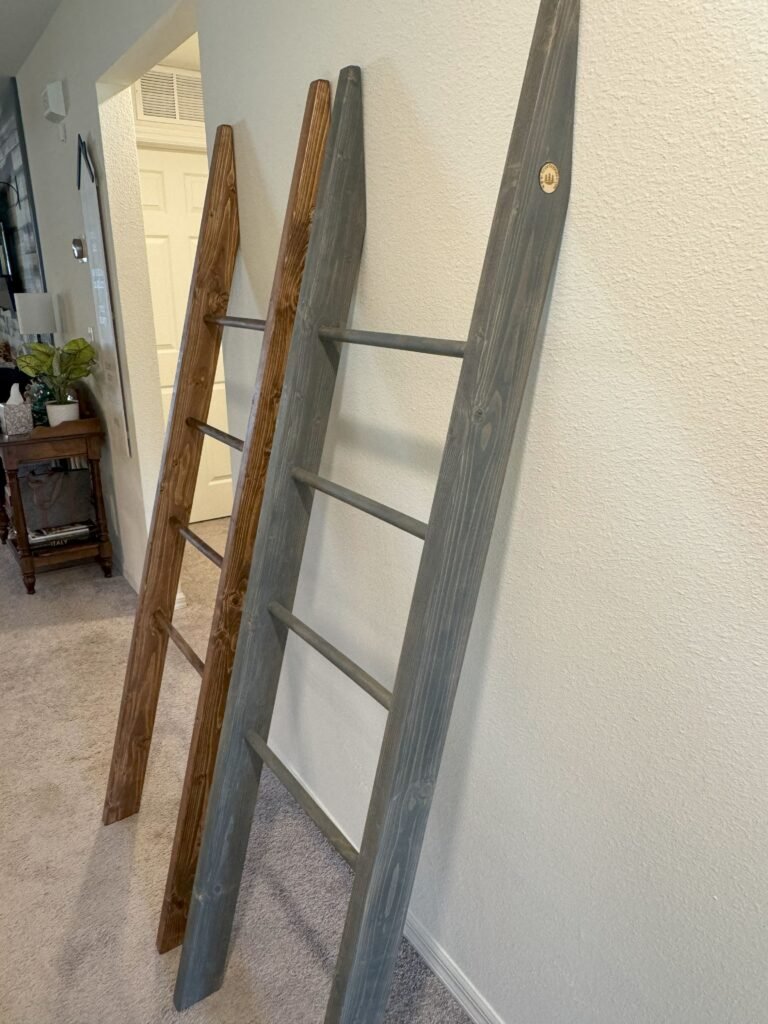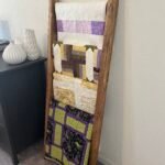 These four rung quilt ladders are approximately 71” high and 20” wide. Available finishes are Early American, grey, and white. Quilt shop owners, please contact us for wholesale discounts on orders of 6 or more quilt ladders with your logo engraved on a medallion on the right side.